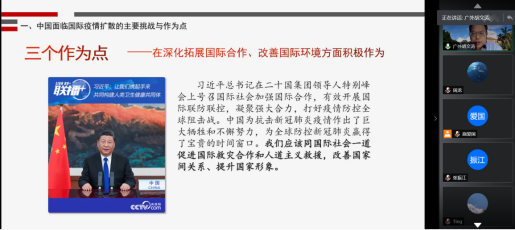 本网讯2020年6月13日,广东外语外贸大学国际关系学院、中国周边战略研究中心通过腾讯会议举办主题为“新冠疫情下的国际关系演进变化与中国周边外交形势”的学术研讨会。来自中国社会科学院、中国现代国际关系研究院、清华大学、中国人民大学、南开大学、中山大学、北京外国语大学、暨南大学、华南师范大学、广东外语外贸大学等科研院所与高校的专家学者齐聚线上,就新冠疫情影响下的全球秩序演变、中美关系、地区合作、中国周边外交等问题发表真知灼见,国际关系学院部分师生参加研讨会。