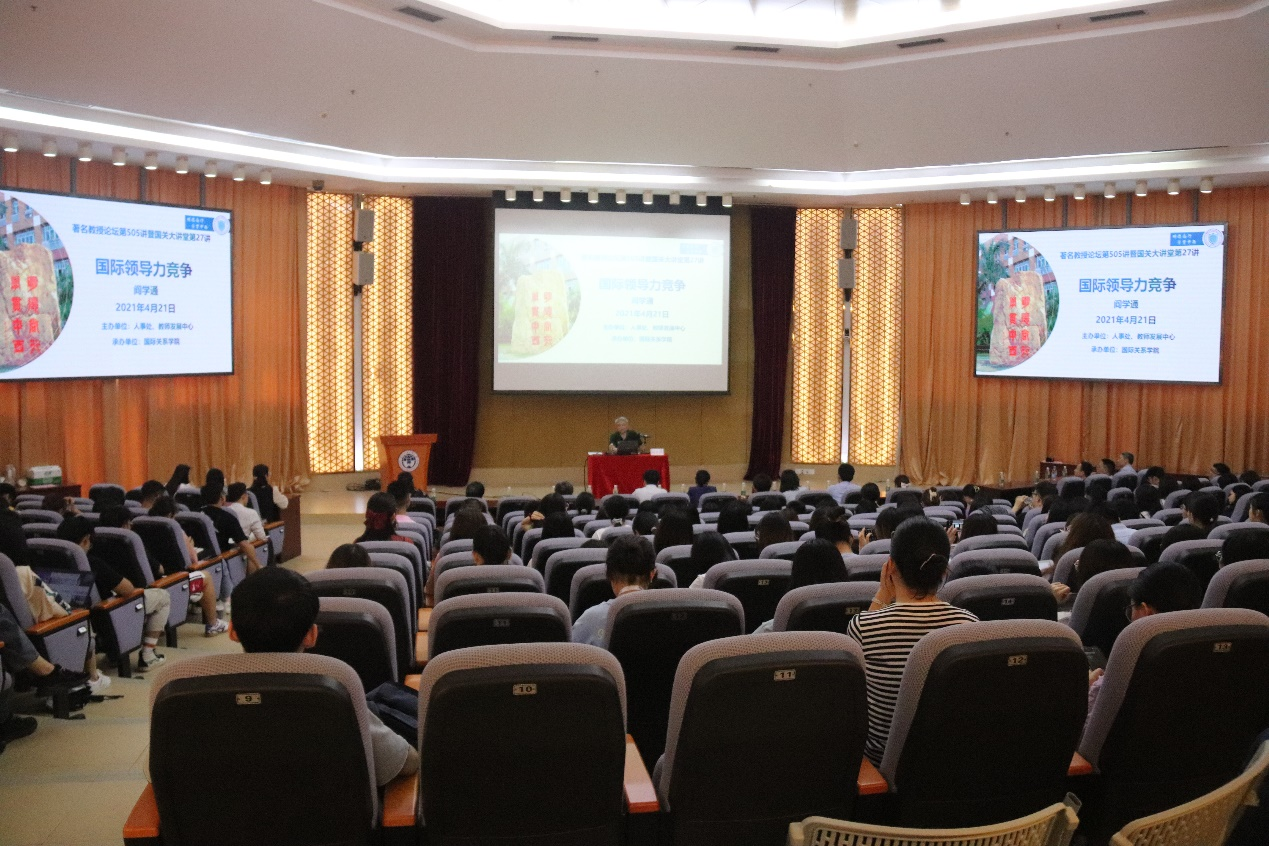 本网讯  4月21日下午,由广东外语外贸大学人事处、教师发展中心主办,国际关系学院承办的著名教授论坛第505讲暨国关大讲堂第27讲在广外南校区八角楼报告厅举行,清华大学国际关系研究院院长阎学通教授作题为“国际领导力竞争”的学术讲座,本次讲座由国际关系学院院长周方银教授主持。校党委常委、副校长王廷惠参加了讲座。