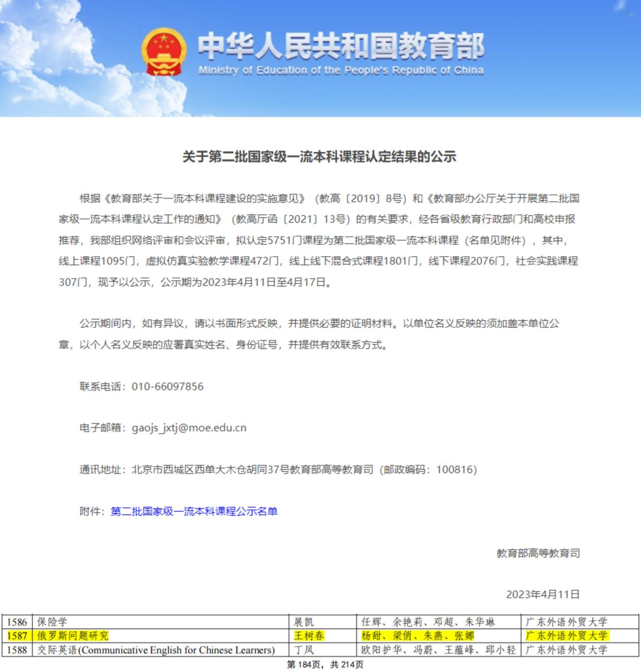 我院王树春教授牵头建设的《俄罗斯问题研究》课程荣获教育部“第二批国家级一流本科课程”认定