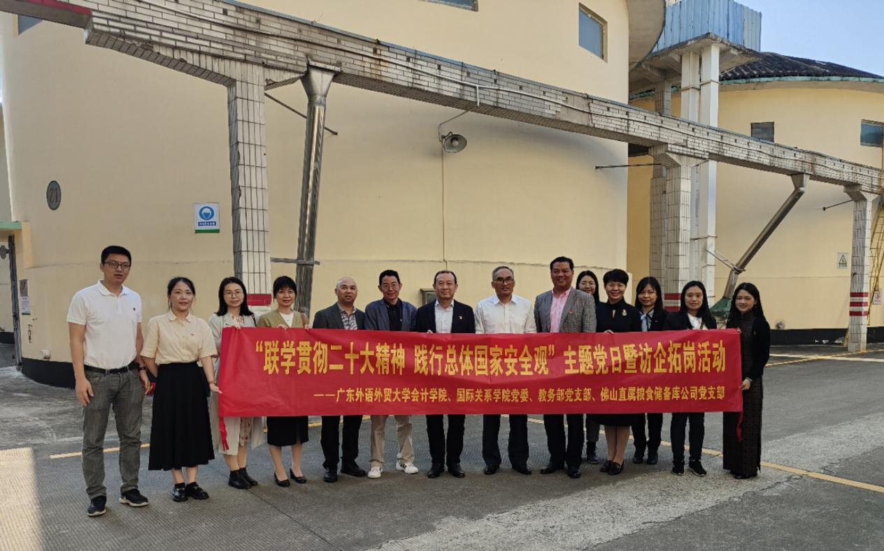 会计学院、国关学院党委和教务部党支部当天还联合佛山直属粮食储备库公司开展“联学贯彻党的二十大精神 践行总体国家安全观”主题党日暨访企拓岗活动。佛山直属粮食储备库公司董事、副总经理,86级会计专业校友黄忠详细介绍了佛山直属粮食储备库公司在保供稳价、中央厨房项目等方面保障粮食安全的举措。我院工会主席施爱国副教授基于国际视野,从八个维度领学习近平总书记关于粮食安全的重要论述。施爱国提到,粮食安全是战略问题,是国家整体安全的重要基础。我们要提高政治站位,深刻理解粮食安全是“国之大者”的深刻内涵。
