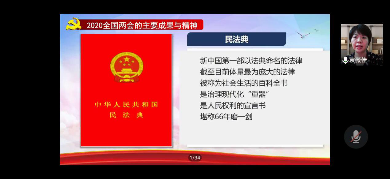 随后,袁薇佳主要介绍今年全国两会的主要成果,并分析这些成果的重要意义。她说,“民法典是新中国第一部以法典命名的法律,是截止目前体量最为庞大的法律,是人民权利的宣言书”、“今年的政府工作报告篇幅比往年减少了近一半,但是分量丝毫不轻”。她认为,今年的政府工作报告体现了“实”和“民”的特色。在新冠疫情爆发的特殊情况下,党中央将疫情防控作为第一要务,坚持把人民生命安全和健康生活放在第一位。同时,今年还是决胜小康的关键之年,政府将民生和经济列为重点工作,坚持“六稳六保促发展”。两会向全国传达了“抓落实”、“善民生”和“增强自身建设能力”的发展精神。
