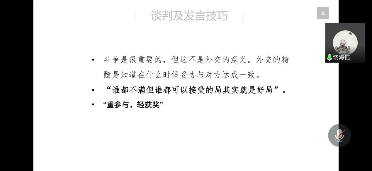 接下来,带来分享的是2018级的饶海钰同学。饶海钰同学曾多次参加模联,其加入的团队还在国家级模联大会--第十六届中国模拟联合国大会中荣获最佳代表团奖。此次活动,她就如何参加模联会议,进行比赛经验分享。