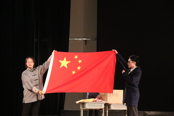 海外留学生刘芳听说开国大典前国旗缝制以及梁思礼等留学生在归国途中制作国旗的故事,宣誓要让五星红旗永远飘扬在天安门广场。