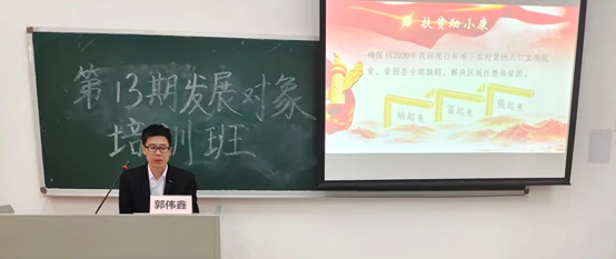 本网讯 2021年12月2日下午15:30,校百年党史大学生宣讲团成员、金融学院郭伟鑫在南校区D107作题为《全面建成小康社会的伟大探索与实践》的党史宣讲,学院组织员王莹、辅导员许怡韬和第13期第2批发展对象参加本次活动。