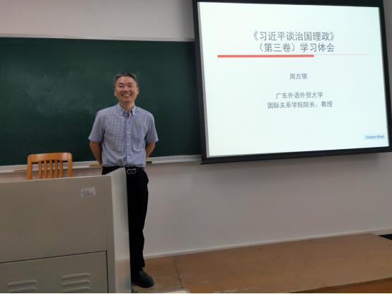 本网讯 9月22日上午,我院院长周方银教授在教学区为我院30余名本科生开讲主题为“当前国际形势与中国特色大国外交”的思政第一课,周方银结合学习《习近平谈治国理政》第三卷的心得,对世界所处百年未有之大变局,中国和平发展所面临的国际环境,中国外交的特质与使命谈了自己的认识。