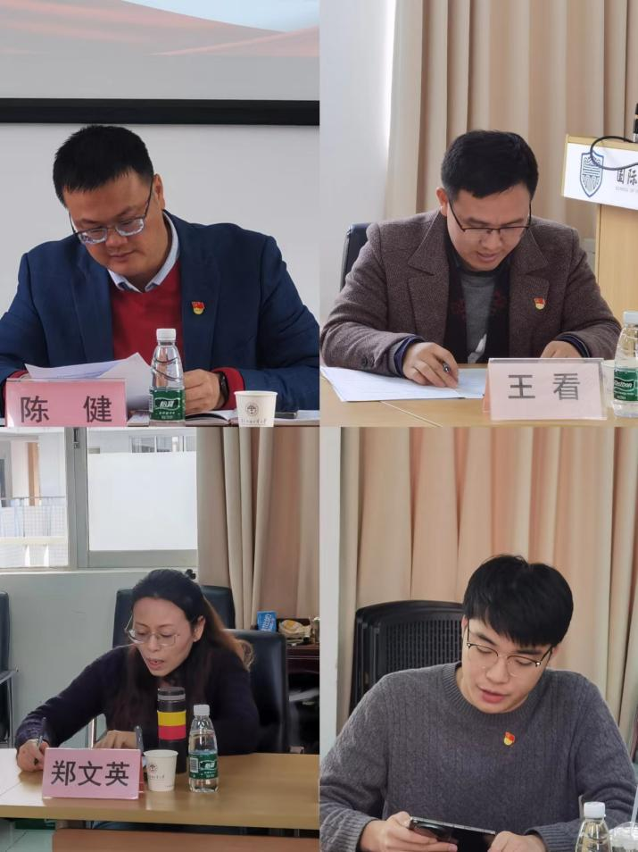 教工党支部书记王看、区域国别研究院党支部副书记郑文英、本科生党支部书记陈健和研究生党支部委员褚浚朗依次回顾了2023年支部工作情况,总结了党建工作的成绩和不足,并对2024年党建工作进行了展望。