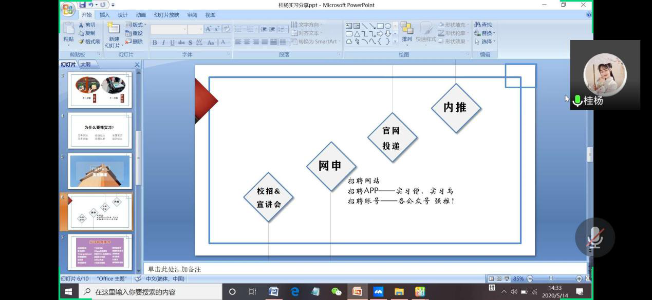 接下来,进行分享的是2017级的桂杨同学。桂杨同学是2018年校长奖章的获得者,还拥有着丰富的实习经历。因此,她就校长奖章的获得条件和如何参与实习以及实习的好处进行了分享。