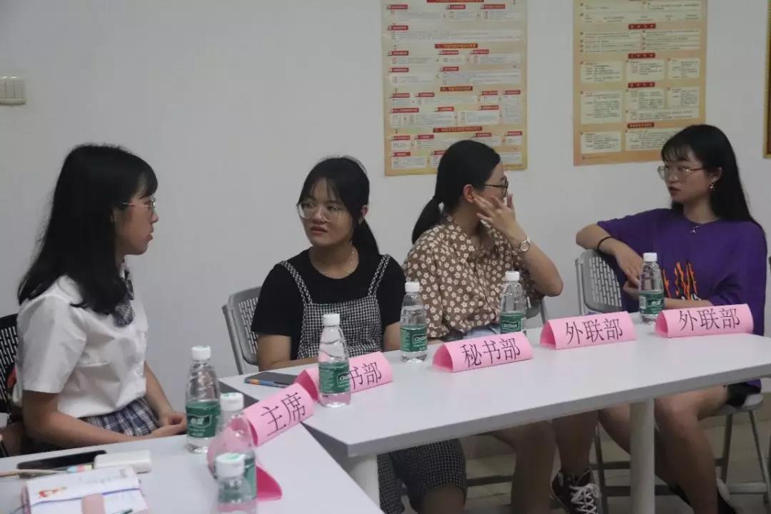 双方团学委员首先做了简单的自我介绍。随后,数统学院团委副书记谢介民介绍了数统团委下设的部门的基本工作,重点提到下学期实践部将举办的“宿舍形象大赛”活动。紧接着,我院团委副书记曾梦婷介绍了国关团委下设的部门的基本工作,并希望通过交流可以找到提高各部门工作效率的方法。