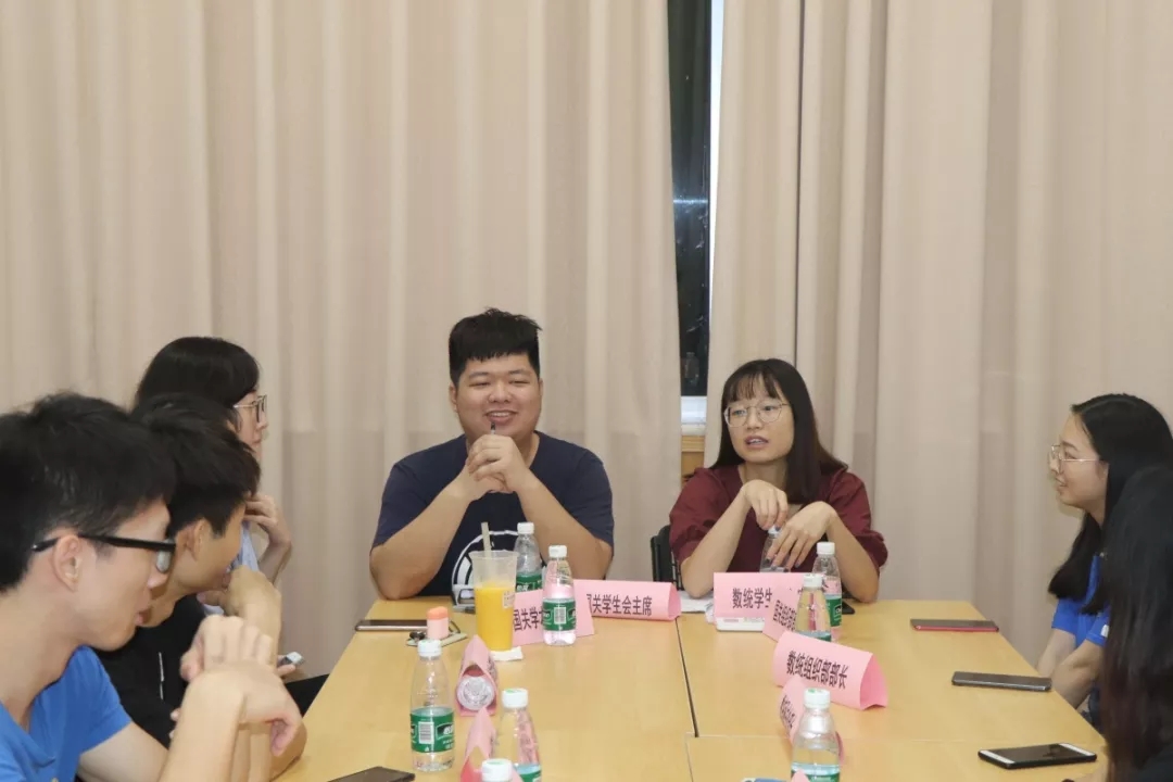 会议伊始,双方团学委员先是做了简单的自我介绍。紧接着,数统团副张钰荧介绍了隶属团委的部门架构和其特色活动。她介绍了团委下设的组织部和实践部的基本工作,着重介绍了数统学院正在进行的三下乡的创新点。然后,我院团副吴君婷介绍了隶属团委的部门架构并介绍其特色活动。她先是介绍了团委下设的秘书处、网媒部和组织部三部门的基本工作。着重介绍了我院的特色活动——由秘书处负责的“钉钉考勤”上课打卡软件。