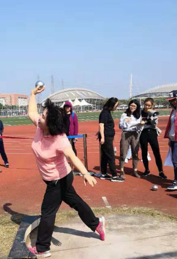 郑腊香老师用尽全力,奋力一掷,把铅球抛向远方,在空中划出一道美丽的抛物线,“砰”的一声落入沙池,留下精彩的痕迹。
