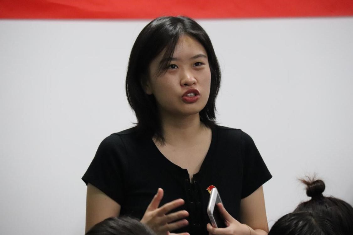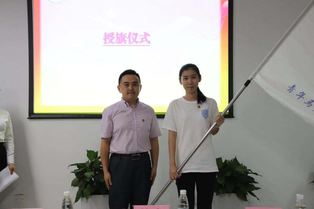 苏奕书记向青马班团支书汤颖怡同学授旗,寄语国关青马工程顺利开展。