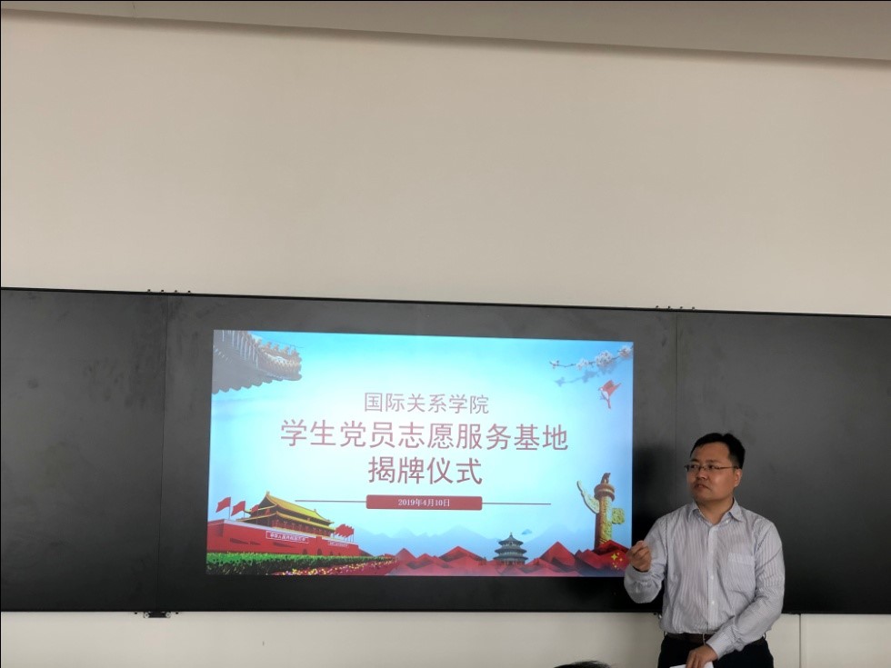 国际关系学院党总支书记孙远雷认为党员志愿者服务基地是青年党员成长的摇篮。而志愿服务活动是我们广大学子增强党性、提高素质的重要途径。他鼓励大家带头参与志愿服务,增强学生党员服务社会、服务他人的意识,更好地体现党员的先进性。借此机会他还对国际关系学院的学生党员们提出了以下要求:第一、思想认识要到位;第二、学习提升要到位;第三、组织管理要到位。