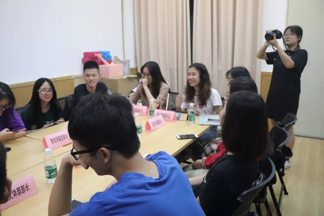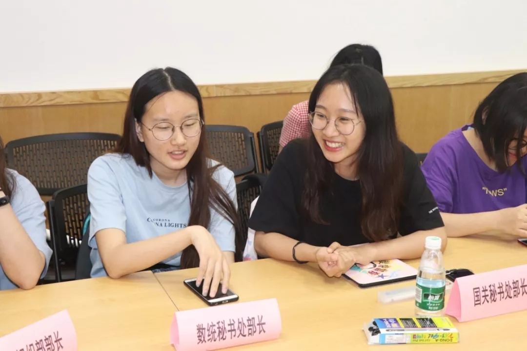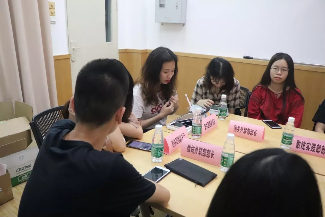 会议伊始,双方团学委员先是做了简单的自我介绍。紧接着,数统团副张钰荧介绍了隶属团委的部门架构和其特色活动。她介绍了团委下设的组织部和实践部的基本工作,着重介绍了数统学院正在进行的三下乡的创新点。然后,我院团副吴君婷介绍了隶属团委的部门架构并介绍其特色活动。她先是介绍了团委下设的秘书处、网媒部和组织部三部门的基本工作。着重介绍了我院的特色活动——由秘书处负责的“钉钉考勤”上课打卡软件。