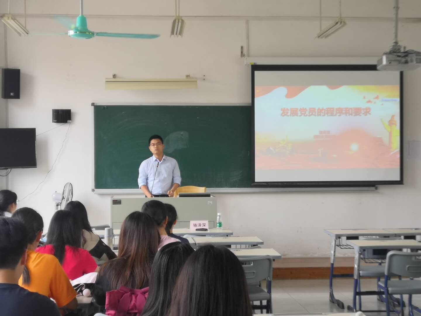 讲座上,首先由辅导员骆泽深老师介绍了发展党员的基本程序和要求,并说明发展党员应当按照提高质量、优化结构、控制总量、发挥作用的总要求,坚持党章规定的党员标准,始终把政治标准放在首位。