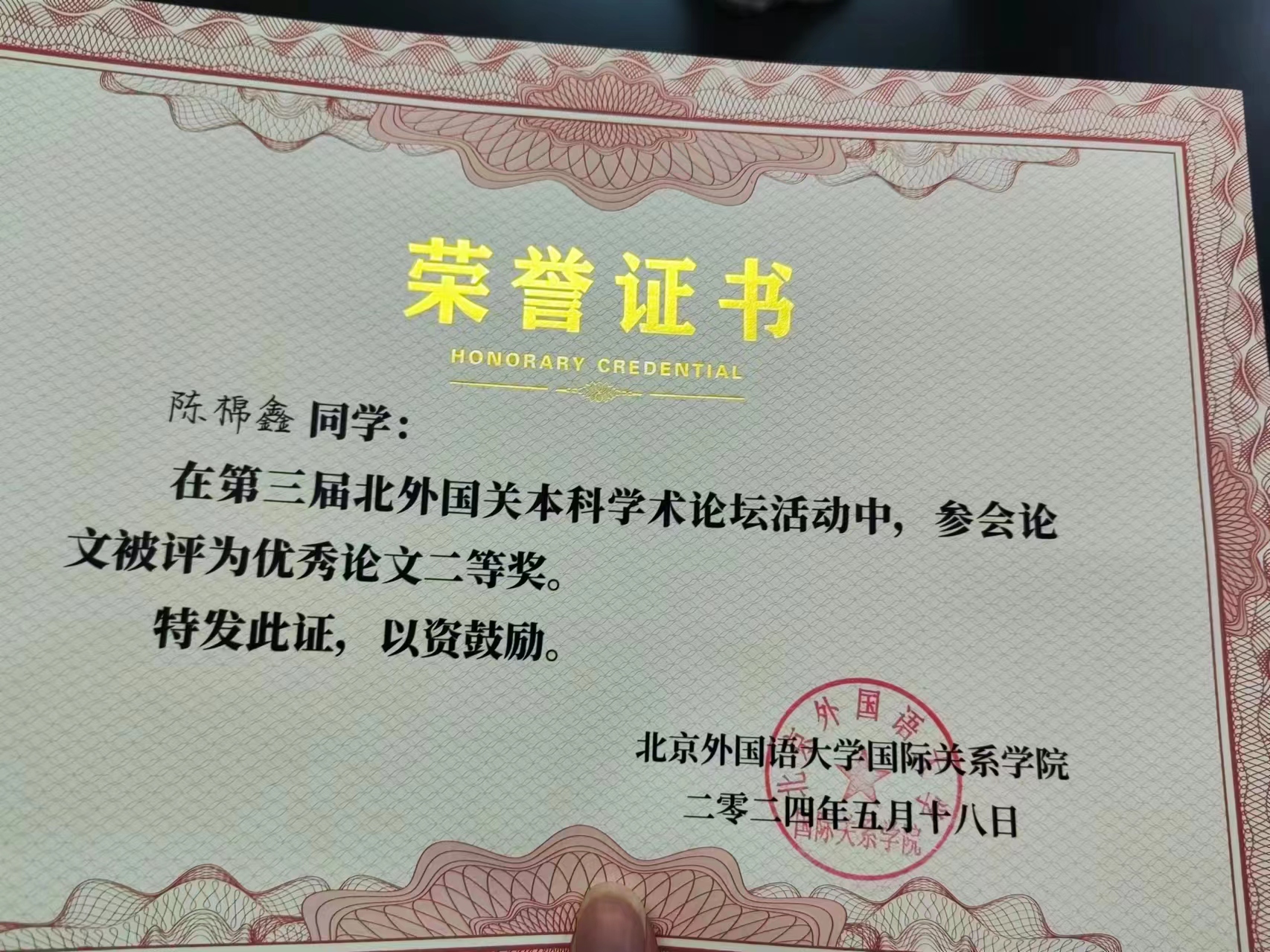 本网讯 5月18日,第三届北外国关本科学术论坛在北京外国语大学举办。我院国组2201班本科生陈棉鑫同学在学院教师刘丹的指导下,完成论文《区块链技术在全球发展治理中的前景与挑战--基于TOED框架分析联合国“基础模块”项目》,顺利入围论坛并宣读论文,最终获得优秀论文二等奖。