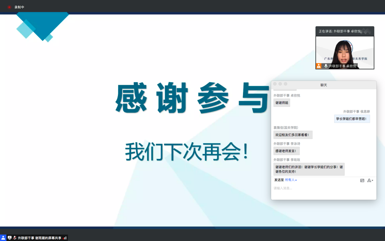 本网讯在广东外语外贸大学55周年校庆到来之际,为庆祝母校华诞,同时为使本院学生更加充分地了解校园生活,作出更合理的大学规划,充分提升就业信心,广东外语外贸大学国际关系学院于11月14日下午通过“腾讯会议”APP平台举行了主题为“吾谋吾业,扬帆起航”的校友交流会。参加本次交流会的嘉宾有:国际关系学院党总支书记袁薇佳、六级组织员钟志荣老师、教授黎家勇老师和辅导员黎思蕾老师。