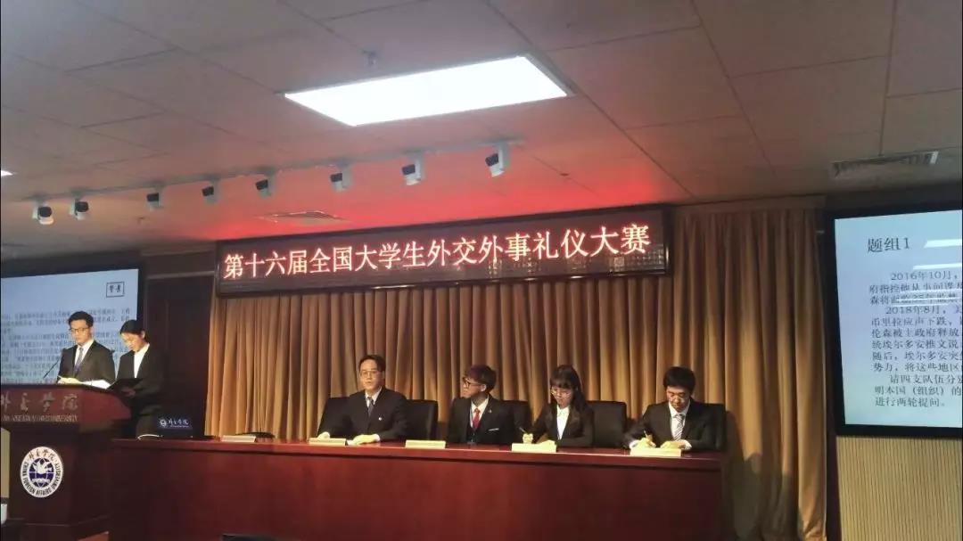 第十六届全国大学生外交外事礼仪大赛于11月30号在外交学院揭开序幕,来自全国各地的三十六支高校代表队齐聚北京,在“中国外交家的摇篮”各展才能,激烈比拼。我校代表队由四名参赛选手、一名领队与两名指导老师组成,在院团委与各级学子的共同努力下,与各高校代表队各展芳华,最终取得了前十名的好成绩。