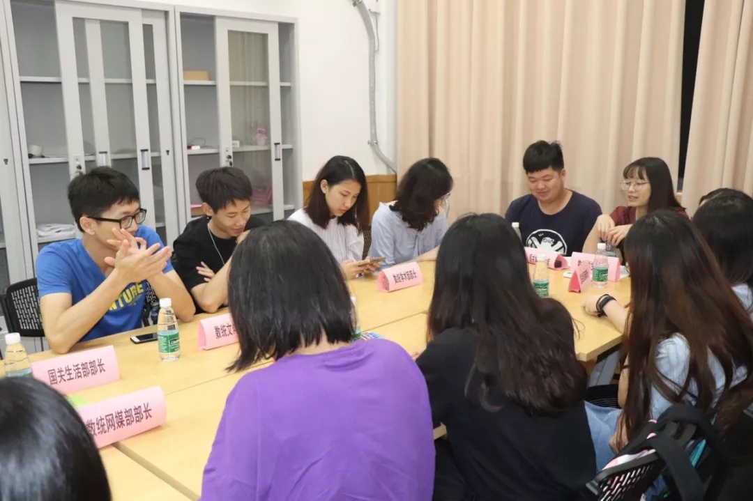 会议伊始,双方团学委员先是做了简单的自我介绍。紧接着,数统团副张钰荧介绍了隶属团委的部门架构和其特色活动。她介绍了团委下设的组织部和实践部的基本工作,着重介绍了数统学院正在进行的三下乡的创新点。然后,我院团副吴君婷介绍了隶属团委的部门架构并介绍其特色活动。她先是介绍了团委下设的秘书处、网媒部和组织部三部门的基本工作。着重介绍了我院的特色活动——由秘书处负责的“钉钉考勤”上课打卡软件。