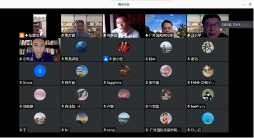 本网讯2020年6月13日,广东外语外贸大学国际关系学院、中国周边战略研究中心通过腾讯会议举办主题为“新冠疫情下的国际关系演进变化与中国周边外交形势”的学术研讨会。来自中国社会科学院、中国现代国际关系研究院、清华大学、中国人民大学、南开大学、中山大学、北京外国语大学、暨南大学、华南师范大学、广东外语外贸大学等科研院所与高校的专家学者齐聚线上,就新冠疫情影响下的全球秩序演变、中美关系、地区合作、中国周边外交等问题发表真知灼见,国际关系学院部分师生参加研讨会。