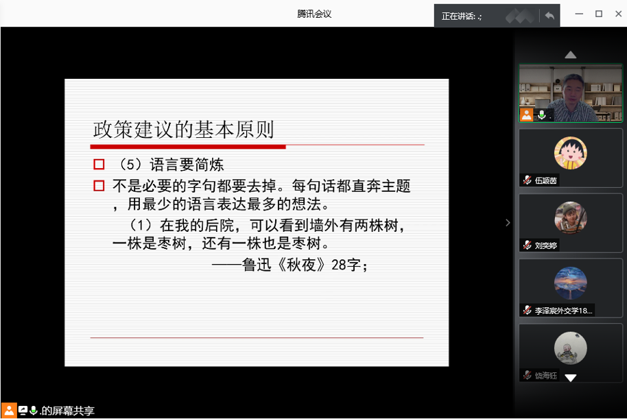 课上,周院长先就提出“政策建议的基本原则”展开了讲解。他说提政策建议首先语言要简练,每句话都直奔主题,用最少的语言表达最多的想法。但有时候为了满足政治需求,会故意提出一些对方听不懂的建议,让对方去揣摩。