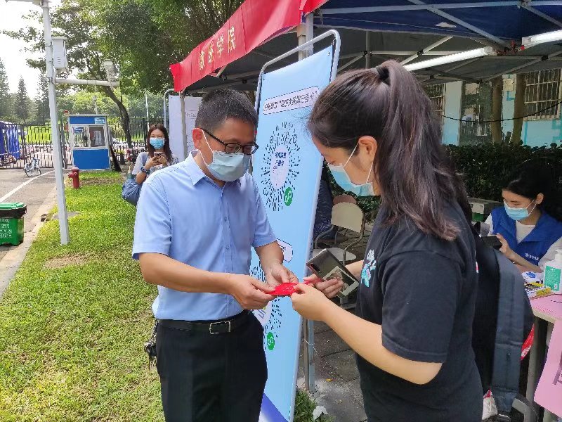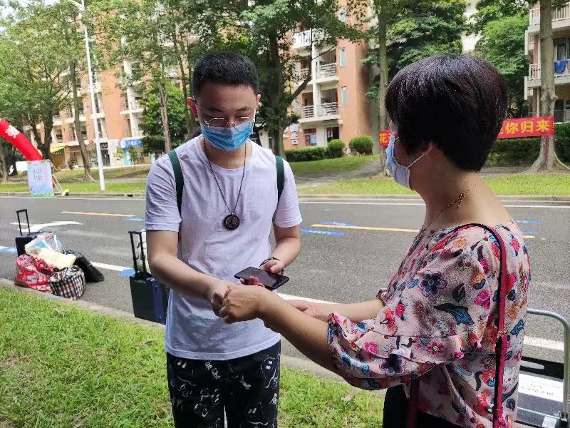 早前,学院统筹安排了8名志愿者为返校学生提供后勤保障服务,做好返校前的准备工作。9月2日,我院设立身份核验登记处和体温检测点迎接返校生。教工党员志愿者在我院报到点为返校学生提供帮助并提醒学生有关疫情防护的注意事项;学生党员志愿者则在校门口依照程序为返校生核验登记身份、检测体温、发放防疫物资,同时也为返校学子送上学院准备的开学礼包。