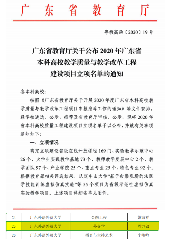 近日,广东省教育厅公布了2020年广东省本科高校教学质量与教学改革工程建设项目立项名单的通知,我院外交学专业获批2020年广东省本科高校教学质量工程项目。