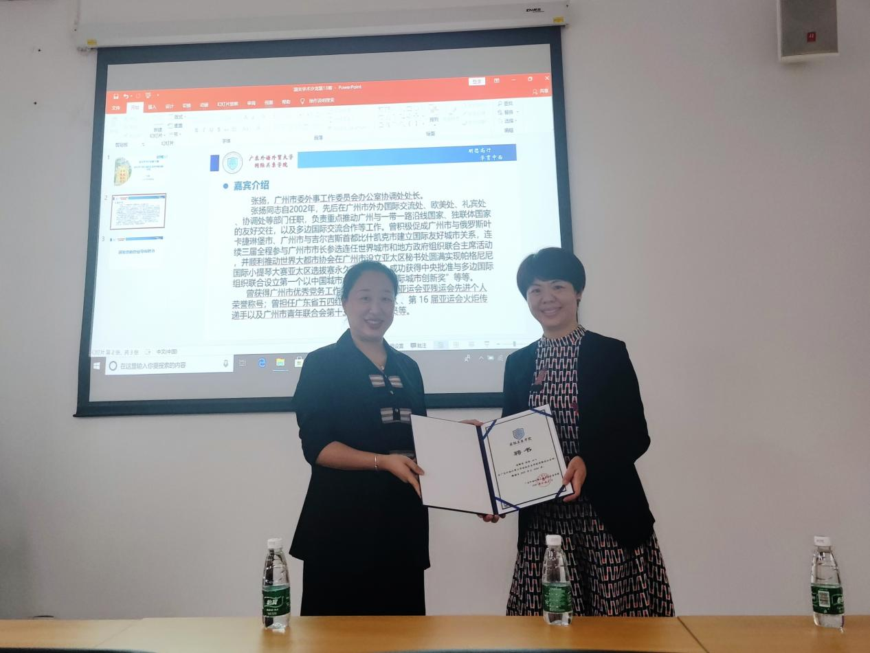 讲座开始,张扬同志为大家介绍了市外办的架构及日常工作,主要有统筹协调、政策研究、对外工作等,并详细讲解了市外办与市委外办的区别。同时她把市外办的职责归纳为“让广州在国际上的朋友多多的,让广州在国际上的交流合作顺顺的,让广州在国外的学习置业安安全全的,让中国声音广州故事在国际上传得远远的”。