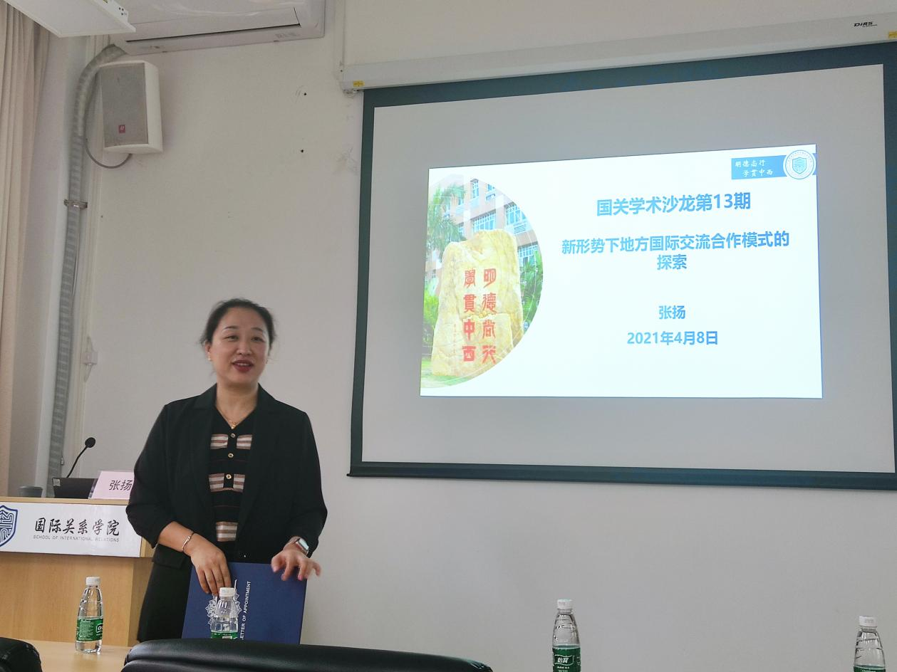 本网讯 4月8日下午,国关学术沙龙第13期在南校区教学楼D402举行,广州市委外事工作委员会办公室协调处处长张扬作题为《新形势下地方国际交流合作模式的探索》的讲座。本次讲座由国际关系学院副院长吴艳主持。