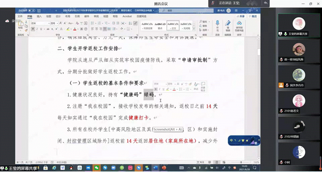 本网讯 8月28日下午15:00和晚上18:30,国关学院2021年秋季学期新生/老生返校申请答疑会通过腾讯会议举行。会议由辅导员王莹主持,辅导员黎思蕾以及全体同学出席相关活动。