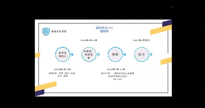 国际政治1701魏斯颖,保研院校专业为澳门大学国际关系及公共政策专业。她为同学们分享了备考法学硕士、准备保研、实习工作的经历,并详细介绍了澳门大学保研所需提交的材料。在个人陈述的文书写作方面,她强调要先概括本阶段的学习,再介绍自己现有的研究、学术比赛及项目、相关实习等信息。因为个人陈述的研究方向和真正入学后的选择并不完全一致,所以可以选择一个对自己来说相对有利的方面着重陈述。