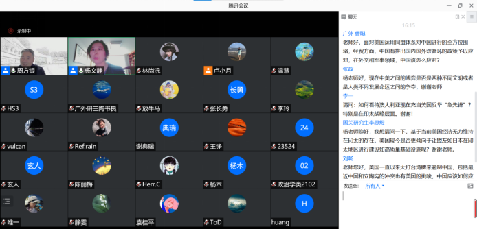 提问交流环节,现场师生就中美竞争下中国在经济与军事的合作伙伴、澳大利亚在美国印太战略和对华政策中扮演的角色和美国的对台政策等话题踊跃提问,杨文静就提问做出专业细致的解答,讲座现场学术气氛浓厚。