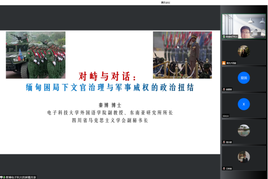本网讯 4月19日,国关学术沙龙第18期在线上举行。电子科技大学外国语学院秦博副教授就“对峙与对话:缅甸困局下文官治理与军事威权的政治扭结”为题作分享。讲座由国际关系学院院长周方银主持。