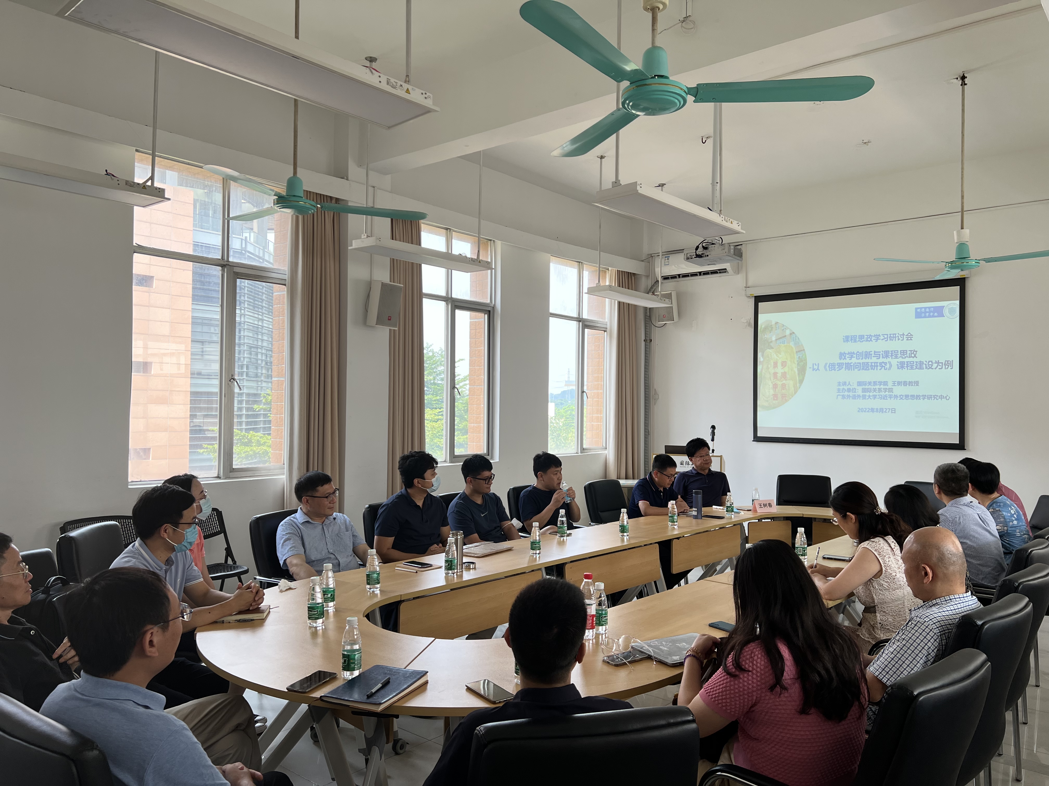 本网讯 8月27日下午,由国际关系学院、广东外语外贸大学习近平外交思想教学研究中心主办的课程思政学习研讨会在大学城校区教学楼D402举行。国际关系学院王树春教授做题为“教学创新与课程思政——以《俄罗斯问题研究》课程建设为例”的专题分享,学院全体教师参与讨论交流。研讨会由院长周方银主持。
