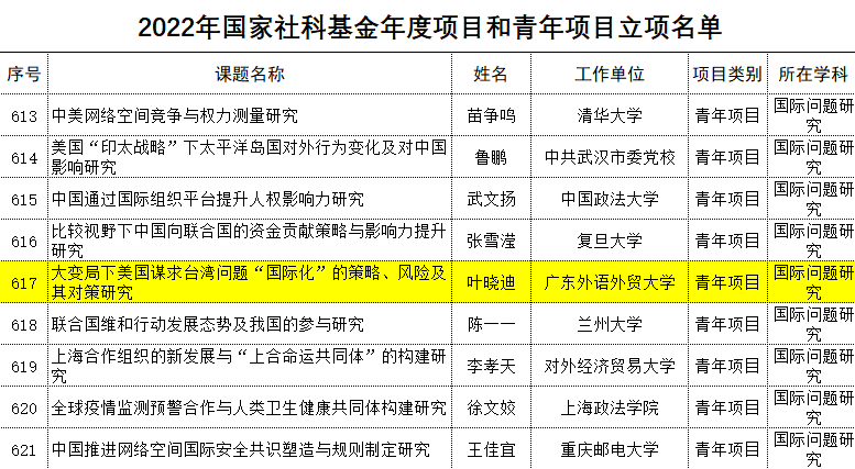 本网讯 近日,国家社科基金年度项目和青年项目立项名单公布,我院叶晓迪博士投标的“大变局下美国谋求台湾问题“国际化”的策略、风险及其对策研究”项目获得青年项目立项。