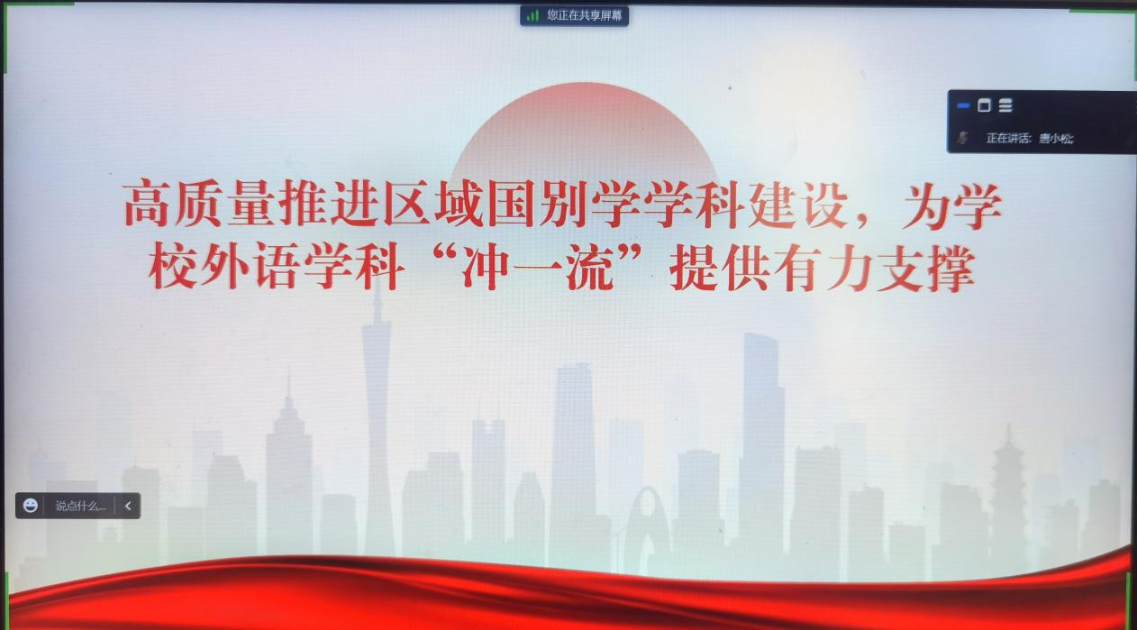 唐小松强调,我们要把深入学习习近平总书记视察广东重要讲话、重要指示精神与推进业务高质量发展深度融合。我校多措并举推动区域国别学学科高质量发展,构建具有广外特色的国别与区域研究体系,积极推动国别与区域研究平台与国际知名高校、研究机构开展实质性科研合作,构建国别与区域研究蓝皮书定期发布机制、成果报送机制、成效反馈机制,为学校外语学科“冲一流”提供有力支撑。区域国别学学科将紧紧围绕创新“学科进入”和“语言进入”的双路径的区域国别研究品牌,培养“多语种+专业能力”的广外特色的区域国别研究人才,打造卓越的中外人文交流平台等目标,进一步提高科研成果质量,打造皮书集群品牌,加强项目和团队建设。
