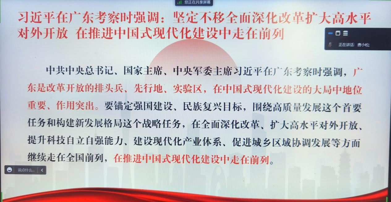 唐小松从时间、空间维度阐释习近平总书记考察广东的重要意义。他指出,广东在中国式现代化建设的大局中地位重要、作用突出。习近平总书记四次考察广东,饱含着对广东不断推进高质量发展的殷切期望,标志着新时代中国特色社会主义不断前进的历史进程,也为广东、为全国发展提供了明确指引、注入了强劲动力。