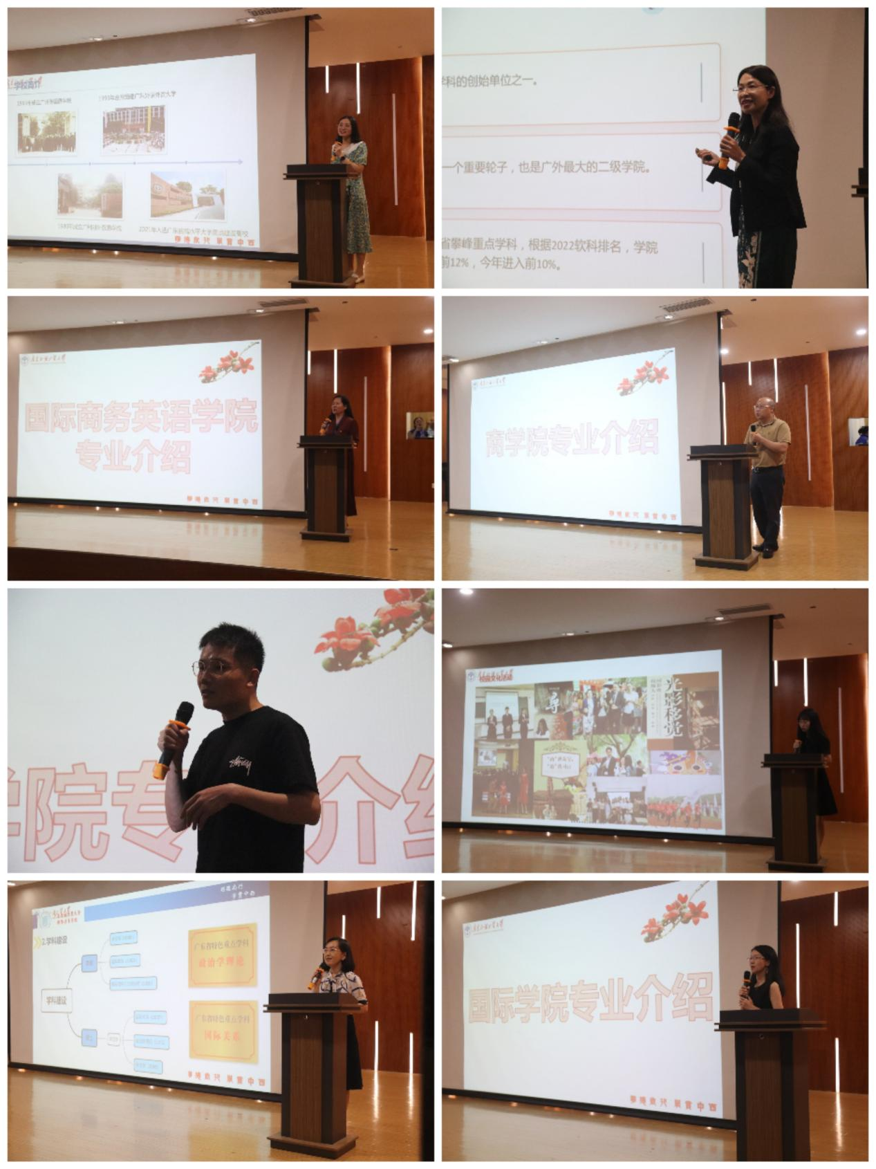 随后,英语学院、经贸学院、商英学院、商学院、金融学院、西语学院、国关学院、国际学院教师代表分别围绕学院专业情况、学院特色、新增专业、就业情况等内容作专题宣讲。