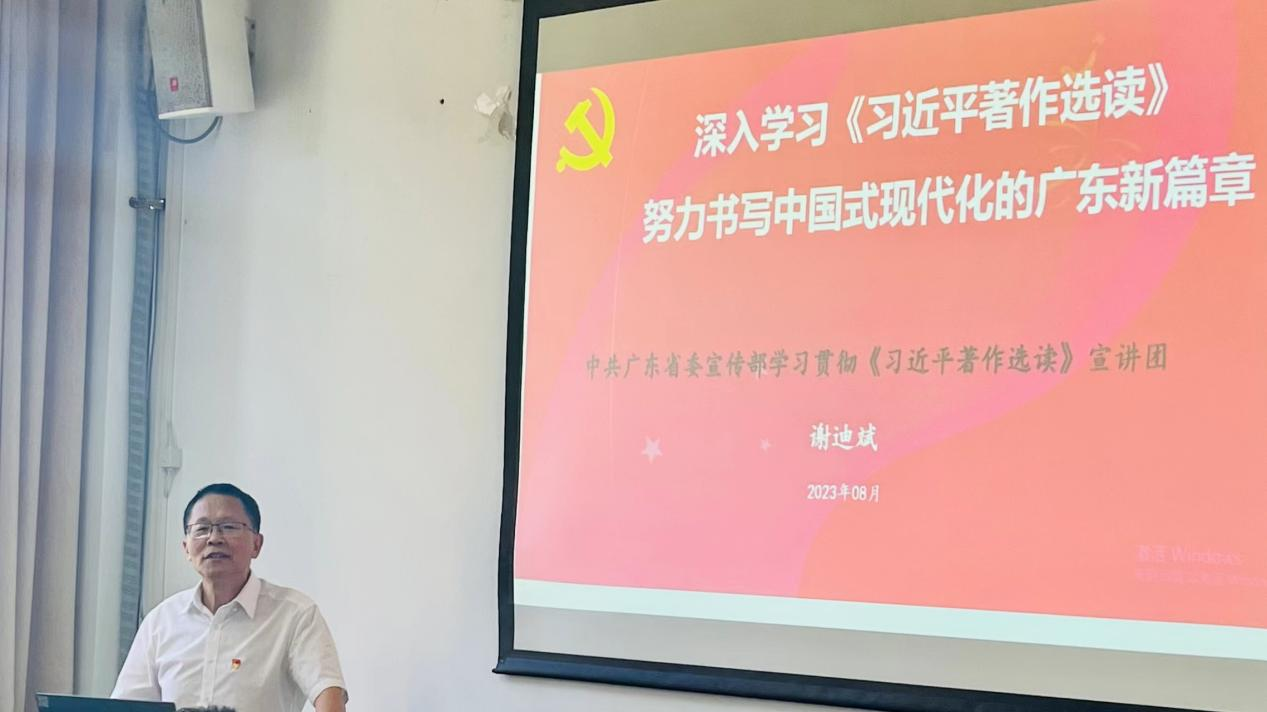 谢迪斌以《深入学习<习近平著作选读> 努力书写中国式现代化的广东新篇章》为主题,从《习近平著作选读》(第一卷、第二卷)出版背景与重要意义,主要篇目与核心内容,学习贯彻与实践行动三个方面展开宣讲。他强调,《习近平著作选读》(第一卷、第二卷)的出版发行,是党和国家政治生活中的一件大事,要把学习《习近平著作选读》(第一卷、第二卷)作为坚持用习近平新时代中国特色社会主义思想凝心铸魂的重大政治任务。