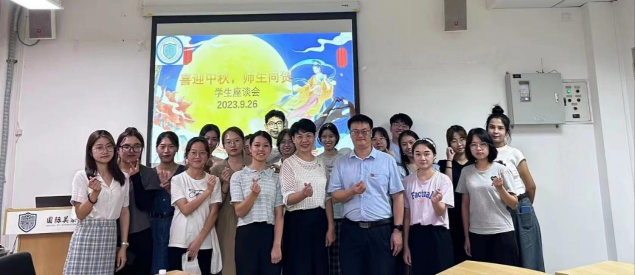 本网讯 9月26日晚上,国关学院举行2023年“喜迎中秋,师生同贺”中秋座谈会,国关党委书记袁薇佳、副书记陈健,辅导员王瑞云老师,教务员易碧敏老师,2023级新生代表和本科生党支部、各社团负责人等出席本次座谈会,会议由杨月瑶同学主持。