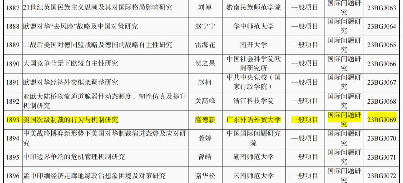 近日,2023年度国家社科基金年度项目和青年项目立项名单公布,我院隆德新副教授投标的“美国次级制裁的行为与机制研究”项目获得年度项目立项;周龙副教授投标的“澜湄合作发展下打造“全球安全倡议实验区”的挑战与对策研究”项目获得青年项目立项。
