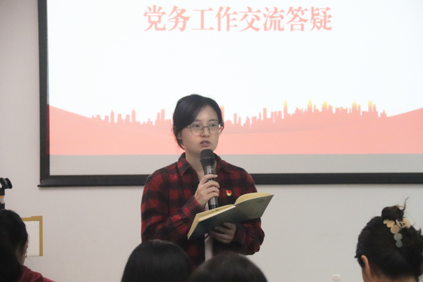袁薇佳书记以《守正创新,笃行致远》为题作党建工作部署。她结合自身多年工作经验,围绕“三个坚持”和“两个优化”,认为党建工作要坚持完善政策和理论学习,坚持创新品牌活动,坚持挖掘内部活力,优化工作程序,优化宣传报道策划统筹,营造积极向上发展整体氛围。同时,她强调党务队伍的传帮带传统,以及日常工作的程序性,要求大家认真学习相关条例文件,提前了解党员发展流程,注重经验积累和错误反思,在今后的党建工作中“显出风采、创出非凡”。
