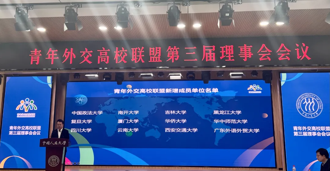 本网讯  4月12日青年外交高校联盟第三届理事会会议在中国人民大学举办。共青团中央书记处常务书记徐晓北京大学党委副书记、副校长、联盟第二届理事会理事长宁琦中国人民大学党委常委、副校长、联盟第三届理事会理事长王易出席会议并致辞。北大、清华、北外等联盟10所创始成员高校和12所新加入高校的理事、导师、专家和青年代表等80余人参加。我校团委书记刘郎、我院党委书记袁薇佳当选为理事我院外交学系主任周龙副教授入选专家团。
