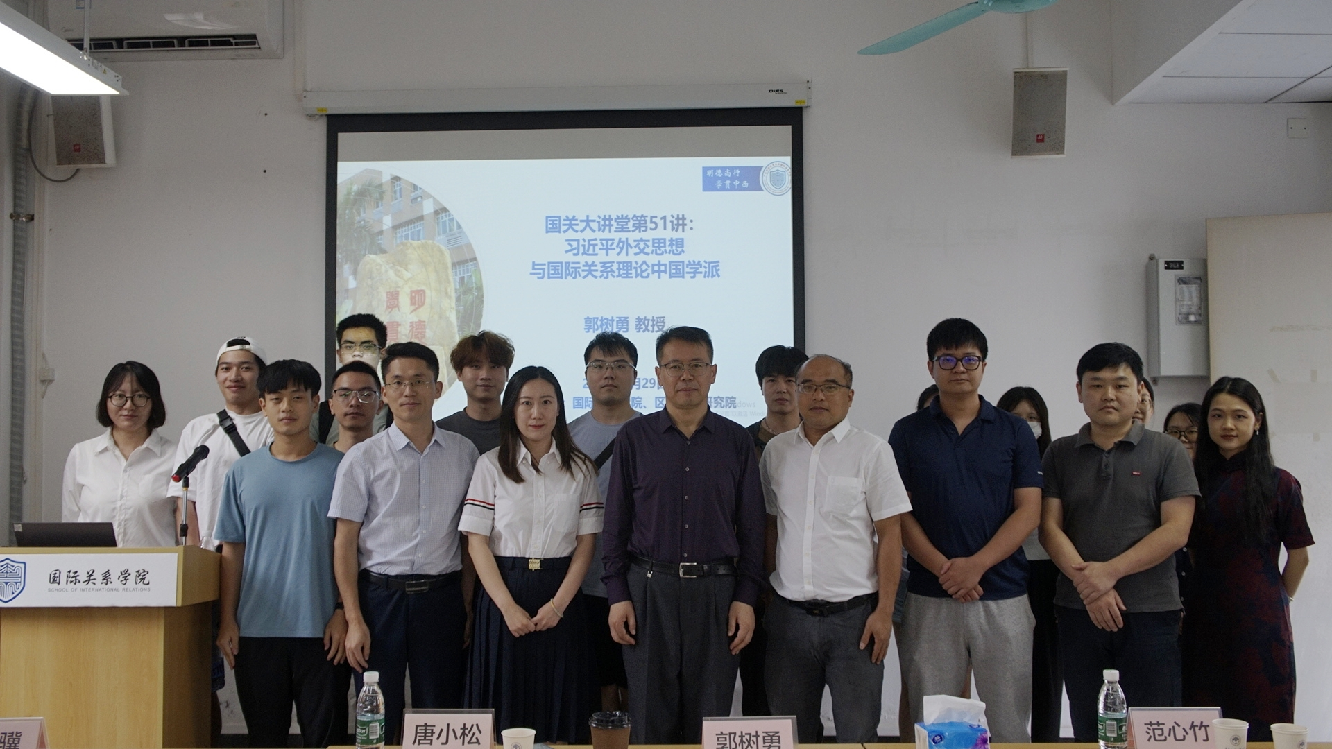 本网讯  529日下午,由我院和区域国别研究院主办的“国关大讲堂”第五十一讲在大学城校区举行。本次讲座以“习近平外交思想与国际关系理论中国学派”为主题,由上海外国语大学国际关系与公共事务学院院长郭树勇教授主讲。该院教学秘书范心竹、MPA办公室教学秘书苑梦圆,上海外国语大学国家重大项目助理黄骥,我院青年教师周龙、叶晓迪、李畅等师生参加本次活动。讲座由院长唐小松教授主持。