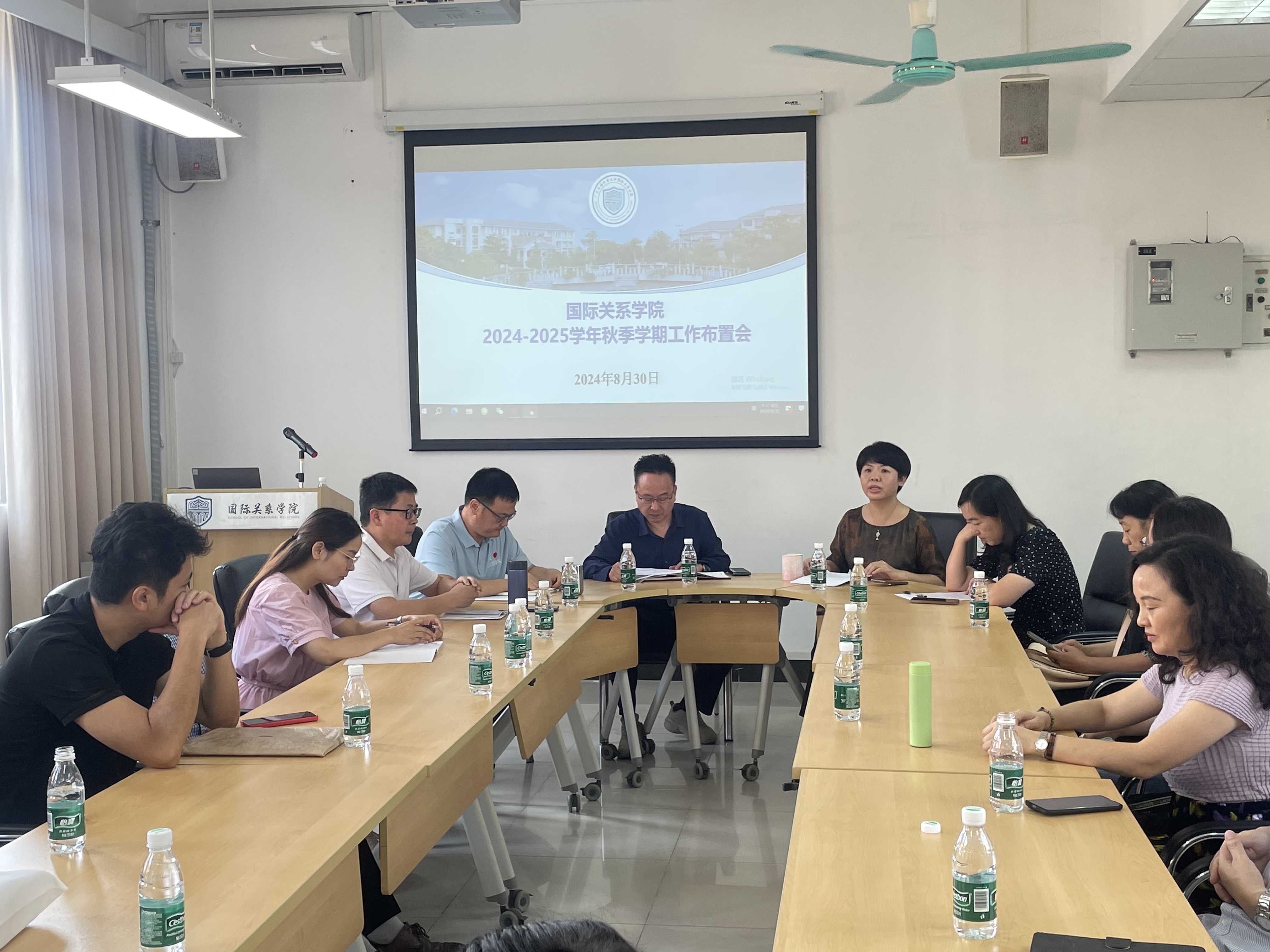随后,副院长吴艳、王志雄,党委副书记陈健分别总结假期工作并就分管工作作具体布置。吴艳指出,我们在新学期要重点做好本科人才培养方案修订、本科生推免、本科生毕业论文指导、本科生导师推荐等工作,并鼓励老师们积极申报教研科研项目。王志雄提到,党政办公室在暑假期间严格落实值班制度,完成了行政秘书招聘、国际组织实验室装修、实验室二期项目申报需求书完善等工作。在新的学期,将细致做好综合服务,尽力资助教职工外出参加学术会议,认真规划国际事务专业硕士点未来建设工作。陈健表示,学生实习就业、暑期社会实践活动、工会活动等工作均获得老师们的大力支持。2024届本科毕业生升学率高达51%,暂列全校第一。希望老师们与学工办加强联动,共同做好学生的教育培养工作。