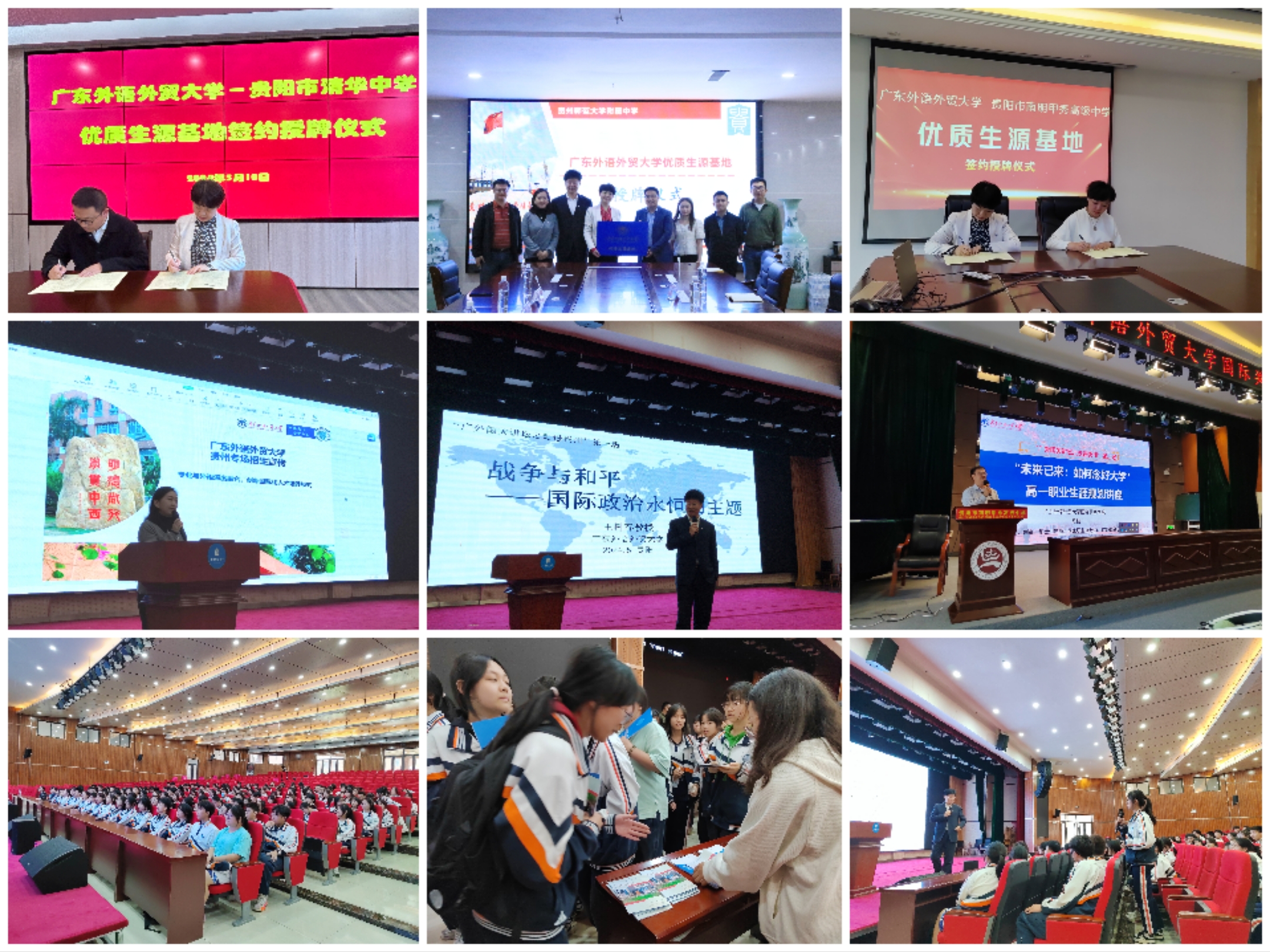 自2024年以来,我院积极拓展招生宣传渠道。在省外,积极联系目标中学,与贵州师范大学附属中学、贵阳市南明甲秀高级中学、贵阳市清华中学签订优质生源基地协议,达成共建人才培养课程合作意向,并开展多场国际政治、职业生涯规划等主题讲座和线下宣讲活动。在省内,深入广佛地区开展招生宣传工作,接待来访中学500余人,赴佛山顺德、琶洲广交会展馆参加高考志愿填报咨询会,赴佛山一中、顺德一中参加招生咨询会,积极参与大学开放日活动等。
