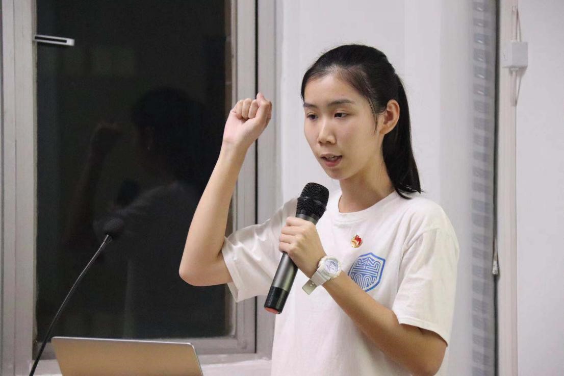 苏奕书记向青马班团支书汤颖怡同学授旗,寄语国关青马工程顺利开展。