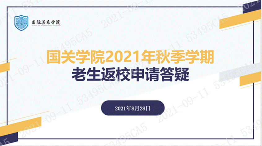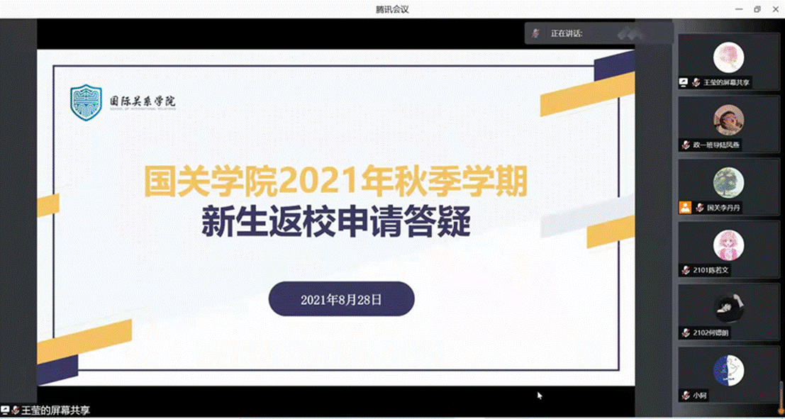本网讯 8月28日下午15:00和晚上18:30,国关学院2021年秋季学期新生/老生返校申请答疑会通过腾讯会议举行。会议由辅导员王莹主持,辅导员黎思蕾以及全体同学出席相关活动。