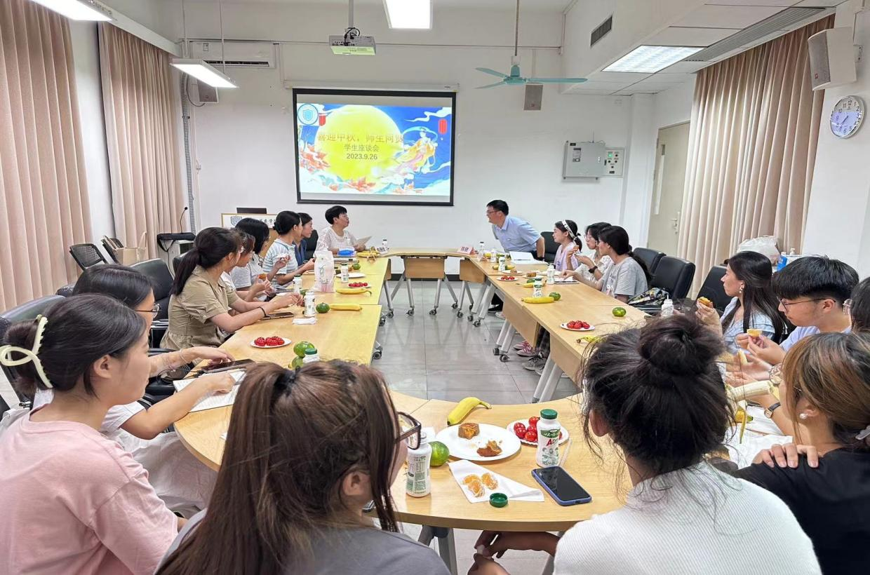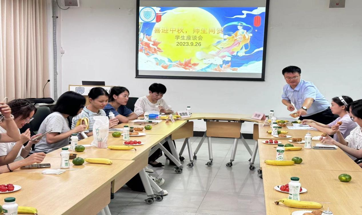 座谈会中,学院的老生代表向新生们传授生活及学习经验,新生们也积极向老师和学长学姐们请教问题。师生们畅所欲言,还一起品尝月饼和水果,气氛热烈而温馨。