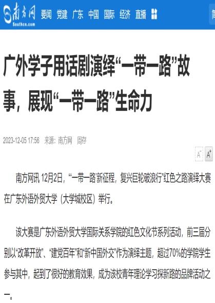 红色之路演绎大赛连续四年举办,学院连续三次获评红色文化节优秀组织奖,获评2023年红色文化节优秀项目。2023年,第三届大赛的剧目和参演学生分别获得《南方都市报》和《广东教育头条》报道;第四届大赛被南方网报道,并被搜狐网、“粤学习”等转载。