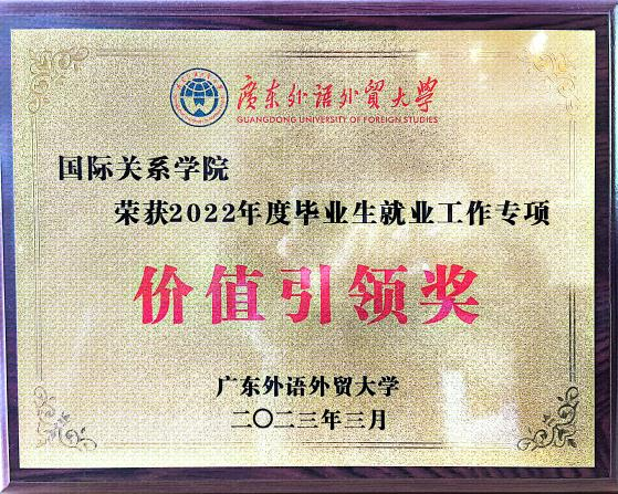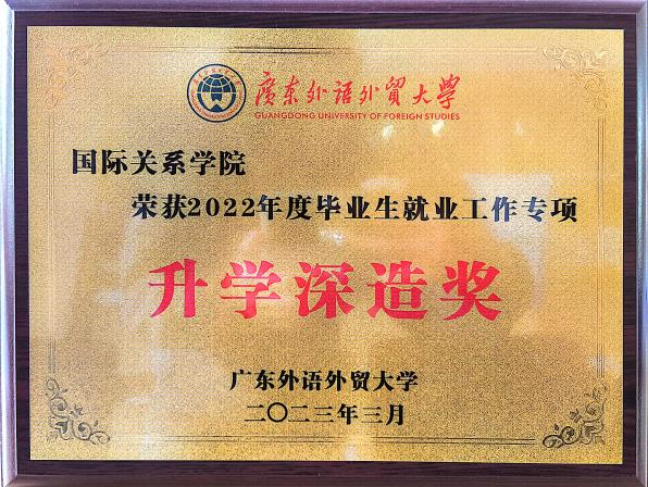 2023年3月,学院获2022年广东外语外贸大学就业工作价值引领奖和升学深造奖